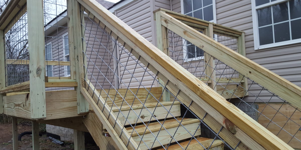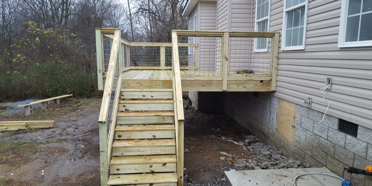 Deck off Kitchen or living room. Stairs down to the back yard