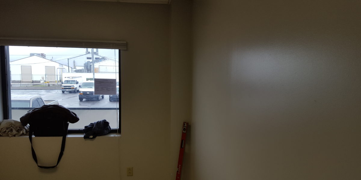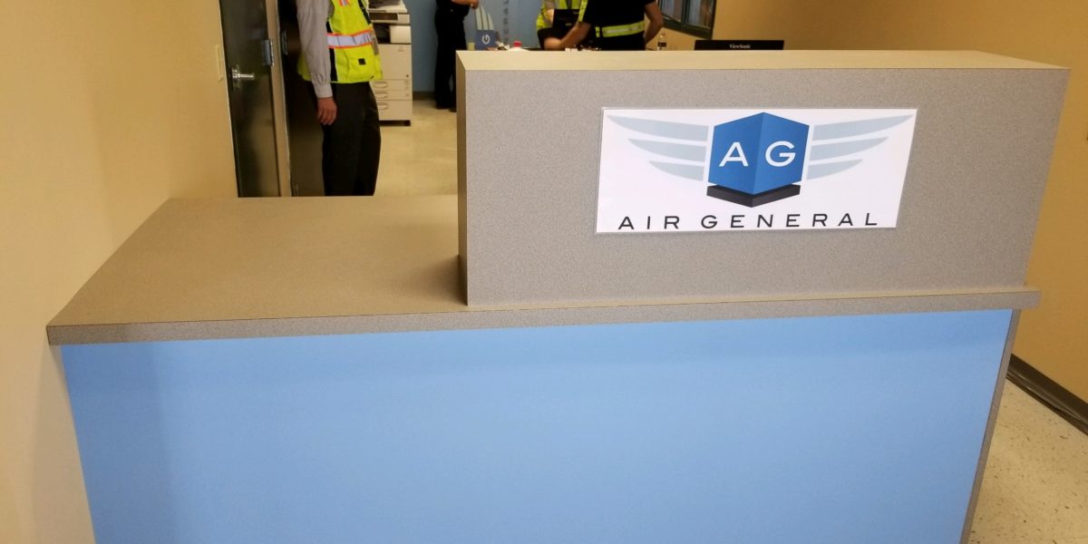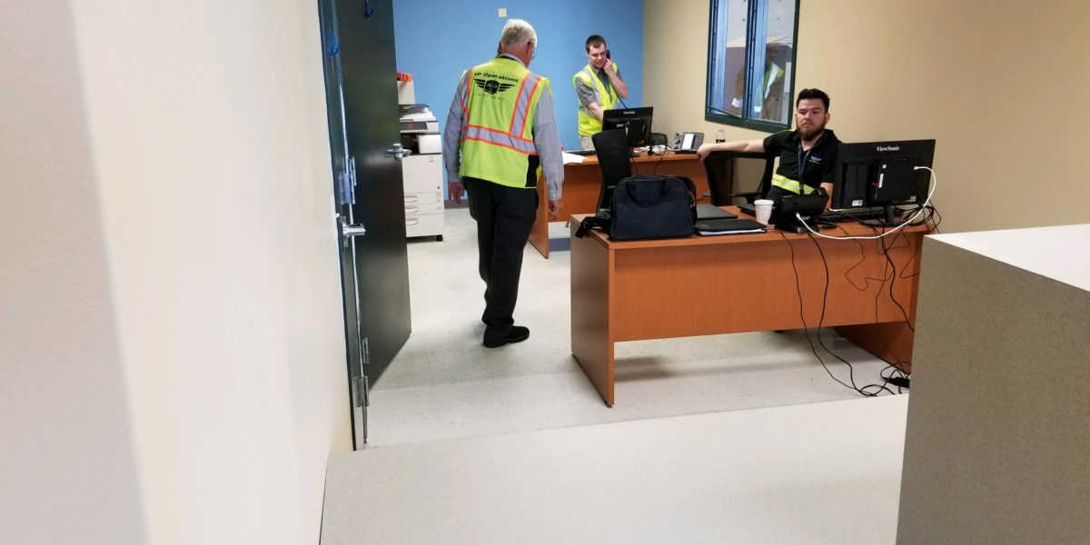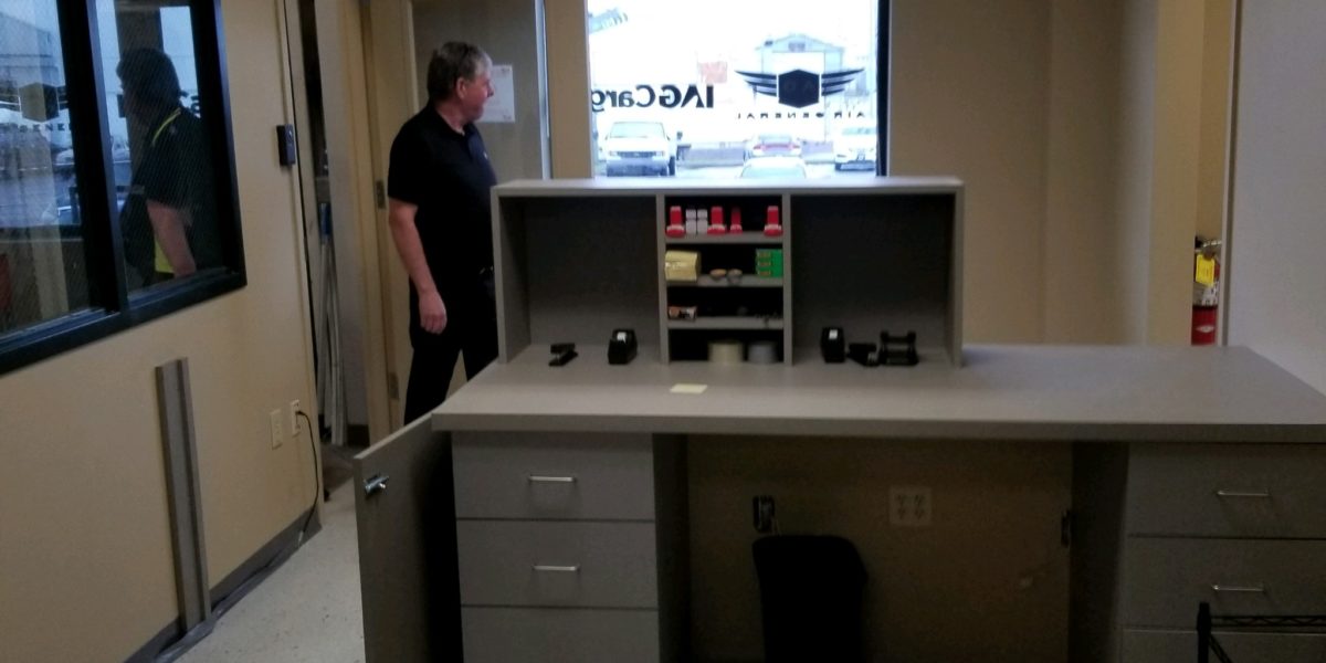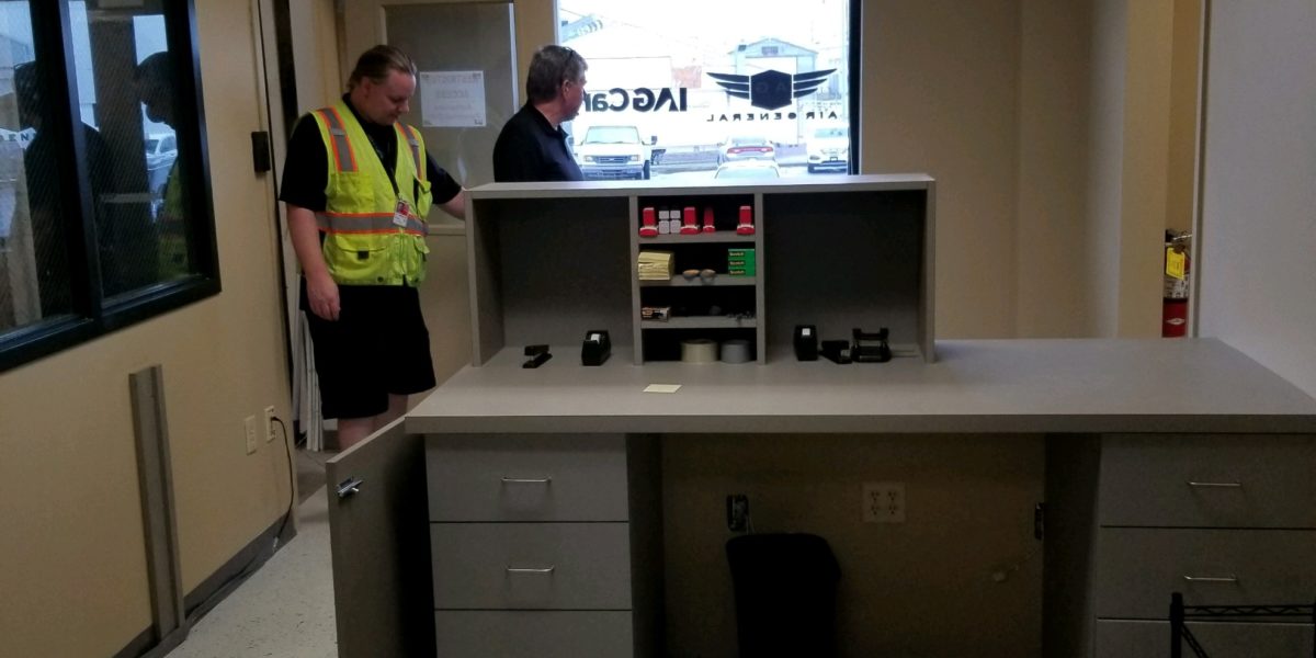 Office area build out for new space at the airport cargo area. Client needed a few walls taken out and a couple of doors installed and a reception area to be added, with electrical and reception desk.